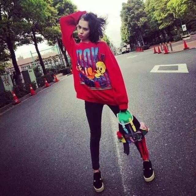 大红色宽松卫衣搭配黑色紧身裤,脚踩黑色懒人鞋, 很个性潮味。