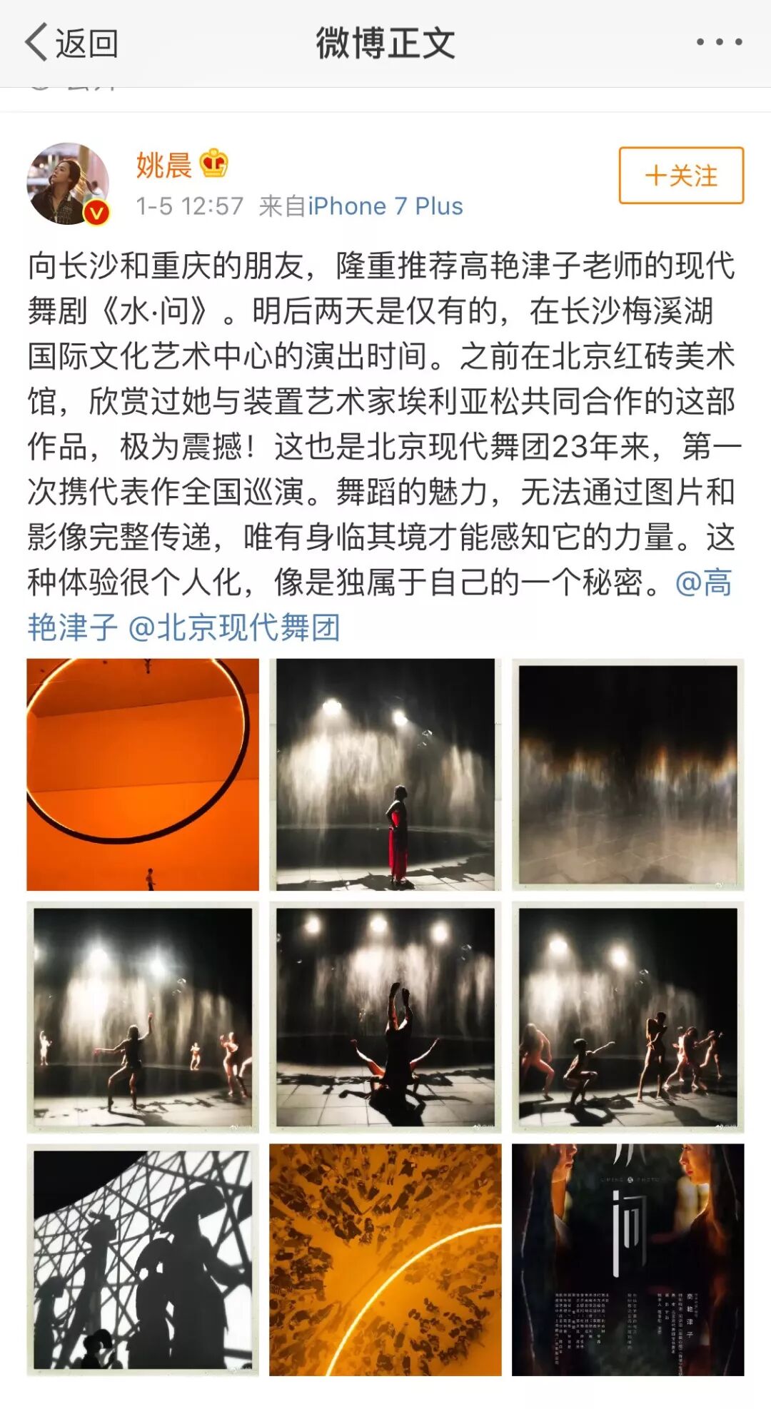 谈及《水·问》的创作,高艳津子表示:“《水·问》的创作是一次大胆的旅行,更是北京现代舞团对这一阶段的自身总结。这个作品,让我涌现出一种新的创作和舞蹈的热情,作品大量调动舞者们用想象力和意念舞蹈,比如想象整个舞台就是一条宽大的河流,舞者敏感的身体从大河深处走来,河流的静与动及水中的游走的生命体都成为舞动起来的原由。”