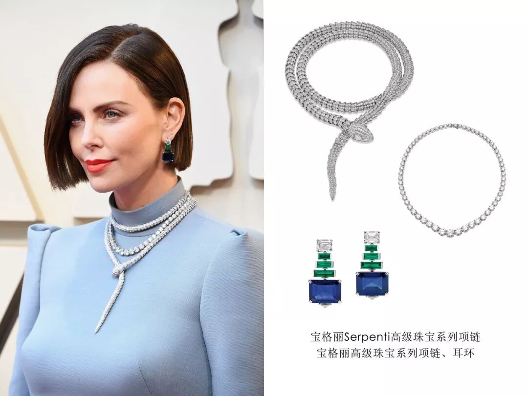 曾获得奥斯卡影后、柏林影后及金球影后的查理兹•塞隆佩戴宝格丽经典标志性Serpenti高级珠宝系列惊艳亮相。超过75克拉的Serpenti项链鳞片密镶钻石,萦绕颈部,魅惑的鳞片闪烁着璀璨光芒,搭配宝格丽高级珠宝系列白色18K金镶蓝宝石祖母绿钻石耳环明艳动人。查理兹•塞隆在此次红毯造型上总共佩戴镶有300多克拉钻石和近20克拉蓝宝石的宝格丽高级珠宝系列,搭配天空蓝露背礼服,诠释一代女王优雅风采。