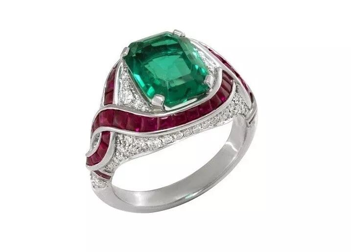 宝格丽高级珠宝系列铂金镶祖母绿红宝石钻石戒指