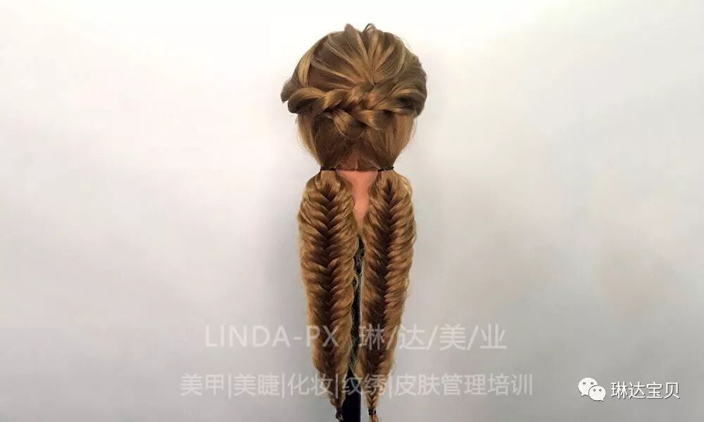 4,后片剩下头发平均分成两股,左边扎个马尾