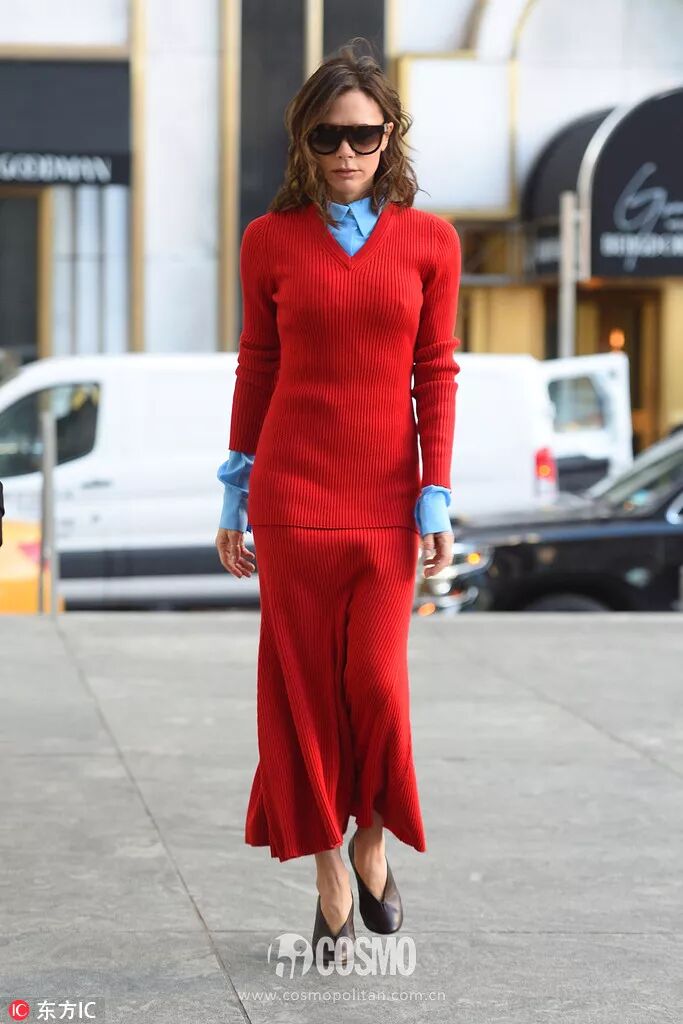 Victoria Beckham用红色毛衣半身裙套装搭配上蓝色衬衫和高跟鞋,做有质感的女人,就是这么简单。