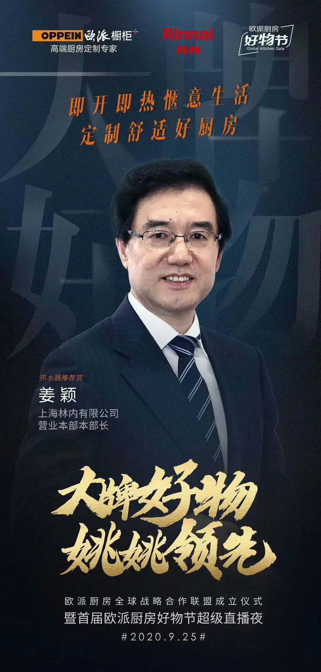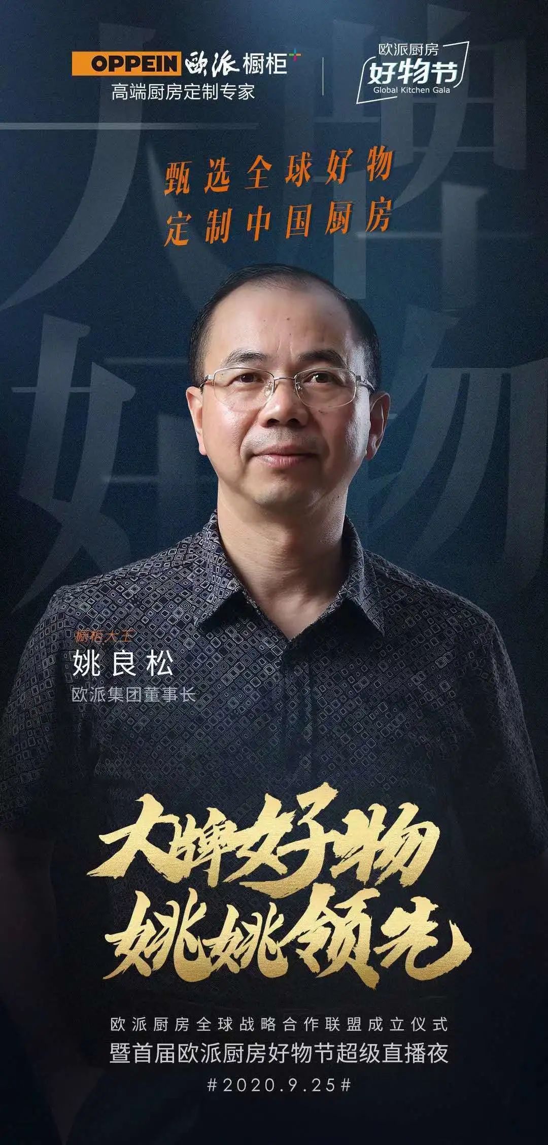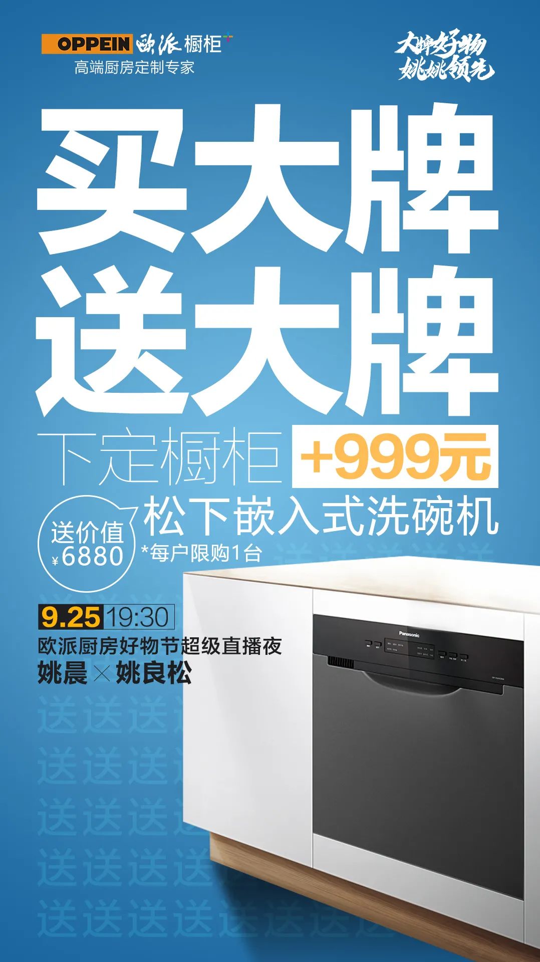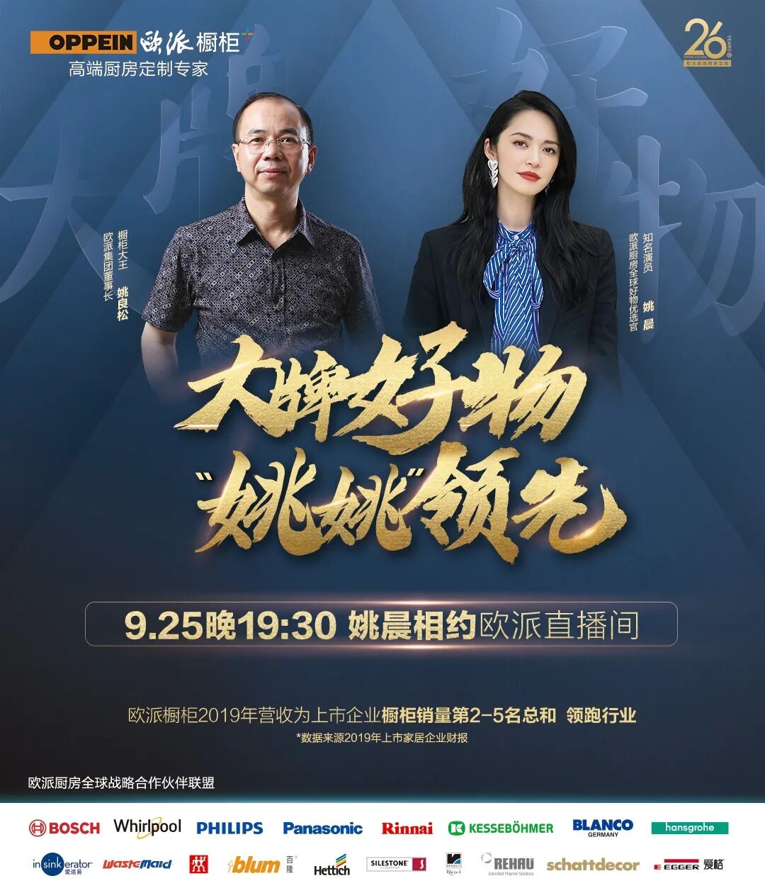 9月25日晚7点半,实力女演员姚晨将走进欧派橱柜直播间,作为欧派厨房全球好物优选官,搭档欧派董事长姚良松同台直播,联合国际大牌齐放价,带给你欧派年度最优惠最大牌最惊喜的厨房好物。