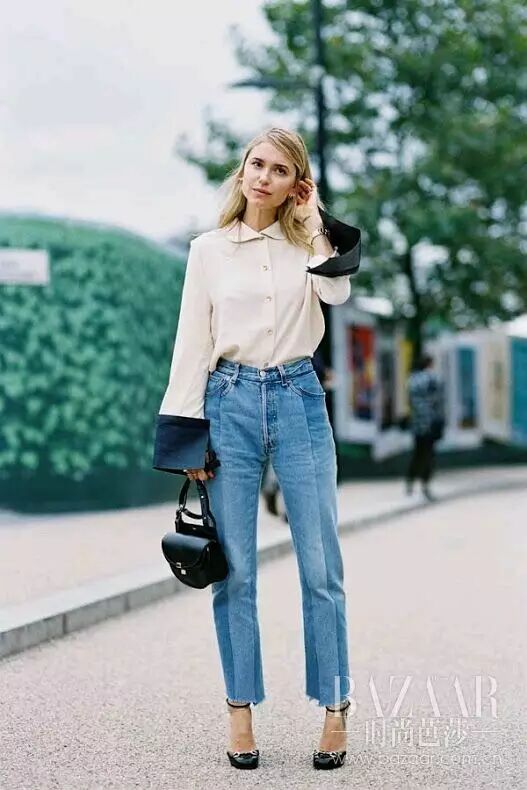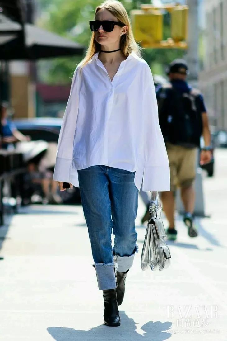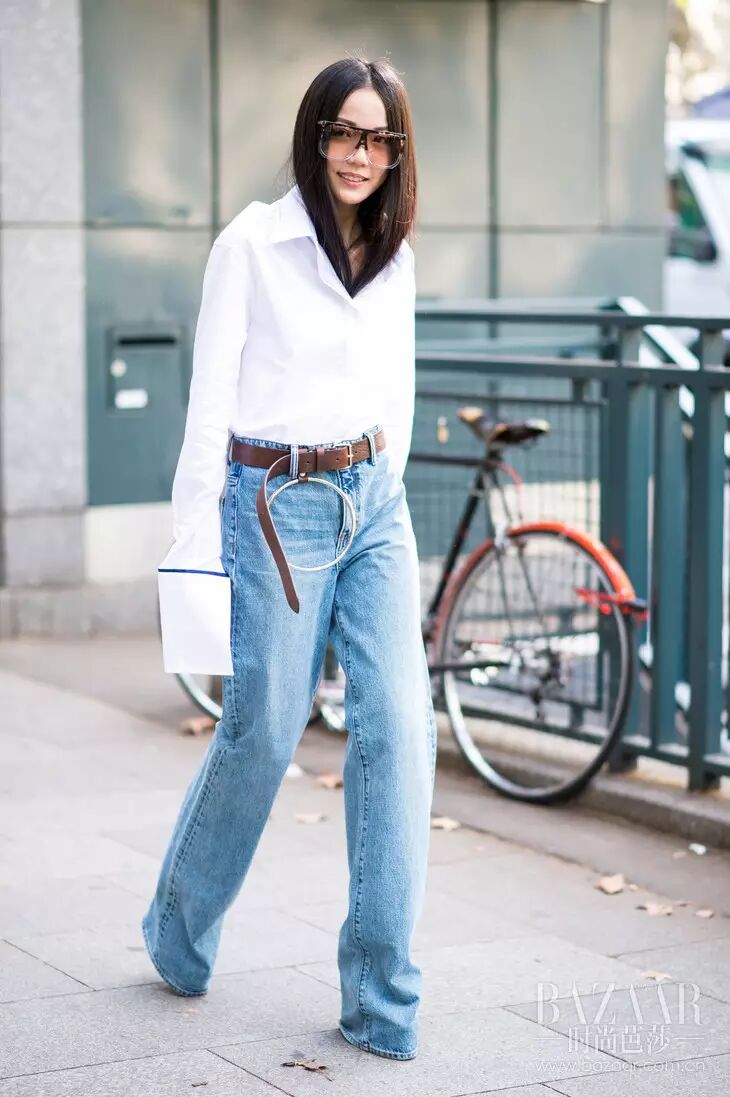 想要把经典搭配白衬衫与牛仔裤穿出不一样,衬衫袖子与牛仔裤腿就要足够长,腰间缀上金属环让整体造型更加精彩。