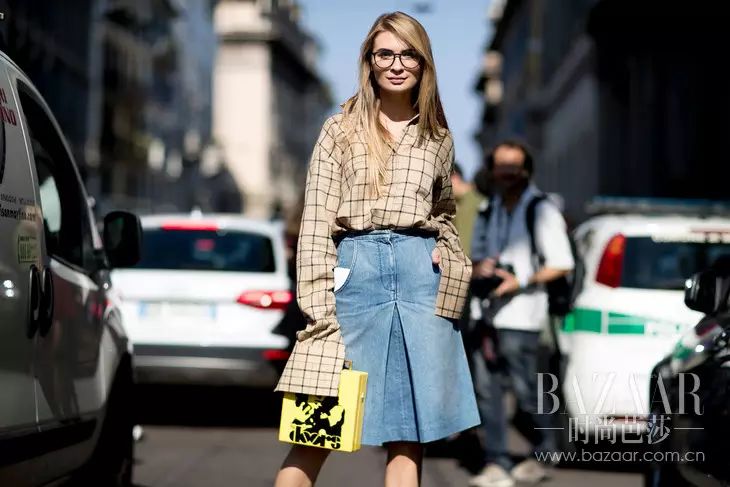 格纹衬衫在超长袖口的衬托下变得格外时髦,搭配牛仔半裙,“袖”出你的阳光态度。