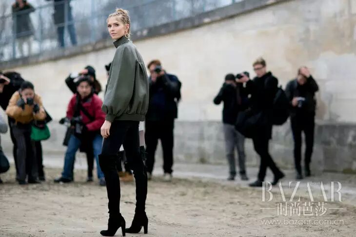花苞型泡泡袖夹克营造出空间感,搭配紧身裤与过膝长靴形成反差,好身材展露无遗!