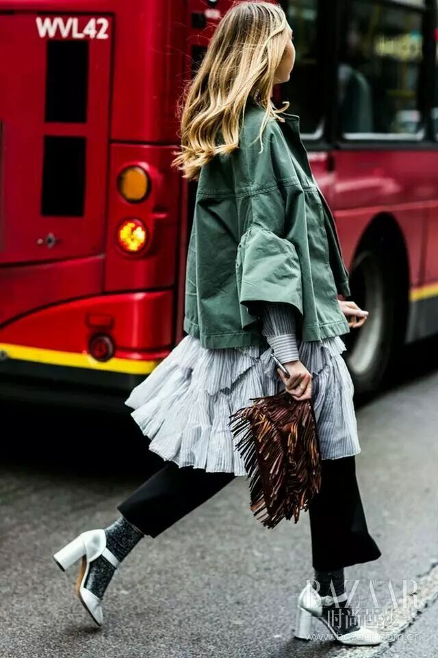风铃感的喇叭袖外套内搭荷叶边饰衬衫裙,层层倾泻出少女感,配上流苏手拿包,好不浪漫的玩转混搭。
