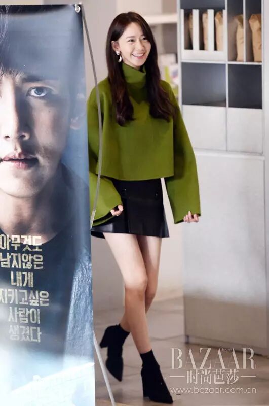 林允儿提前将2017的流行色草木绿穿上身,青草绿喇叭袖上衣配上黑色皮革短裙,甜美可人~