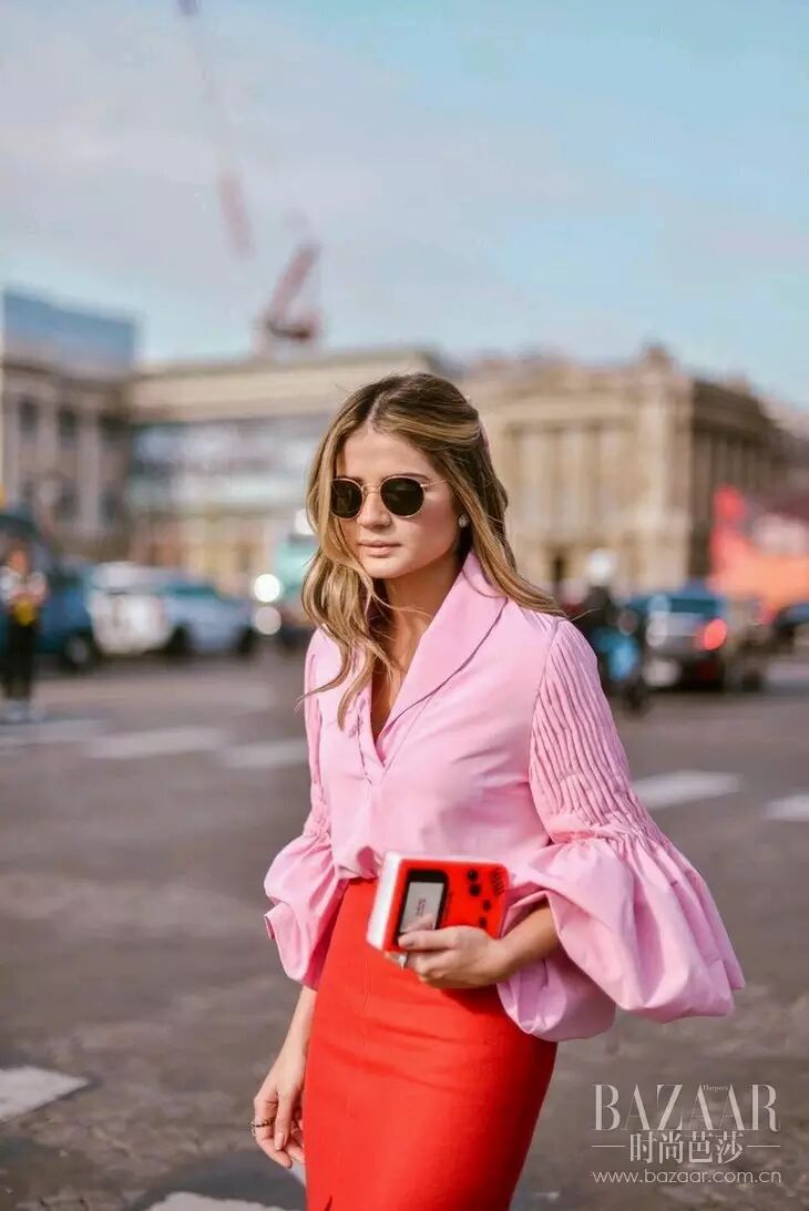 泡泡袖的粉色衬衫也是不错的选择,搭配高腰包臀裙,浪漫妩媚!