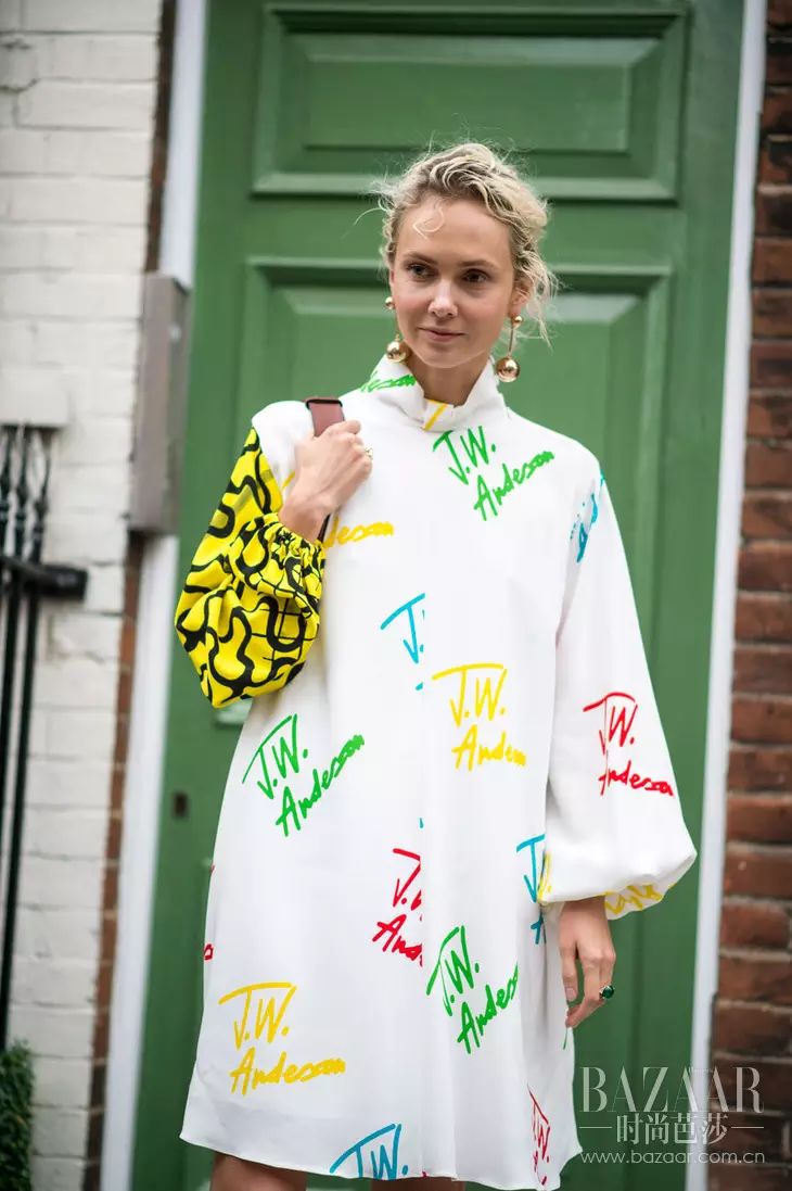 宽大泡泡袖连衣裙配以不对称印花增添风趣,签名式的涂鸦Logo也让造型更具街头范~