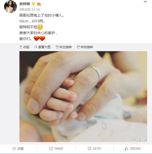 昨晚,世界小姐张梓琳在微博宣布了女儿出生的喜讯