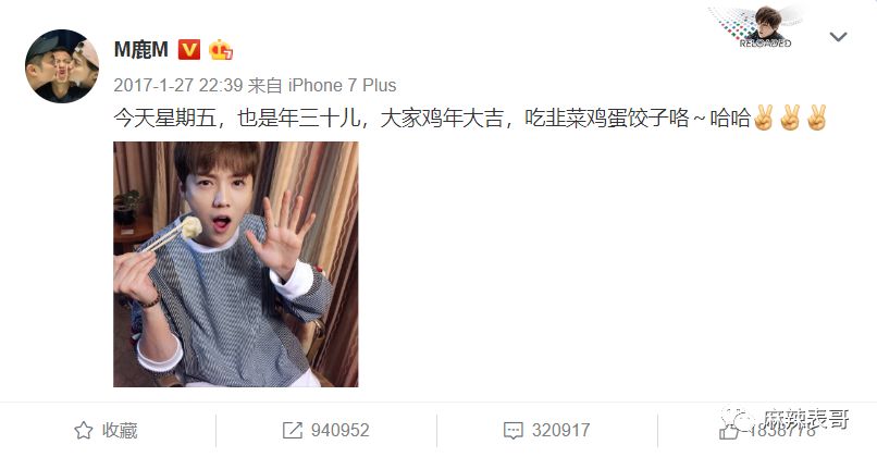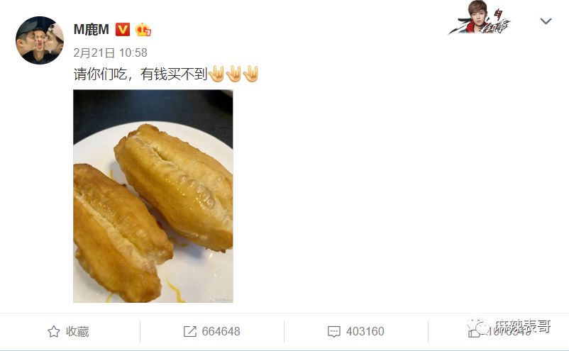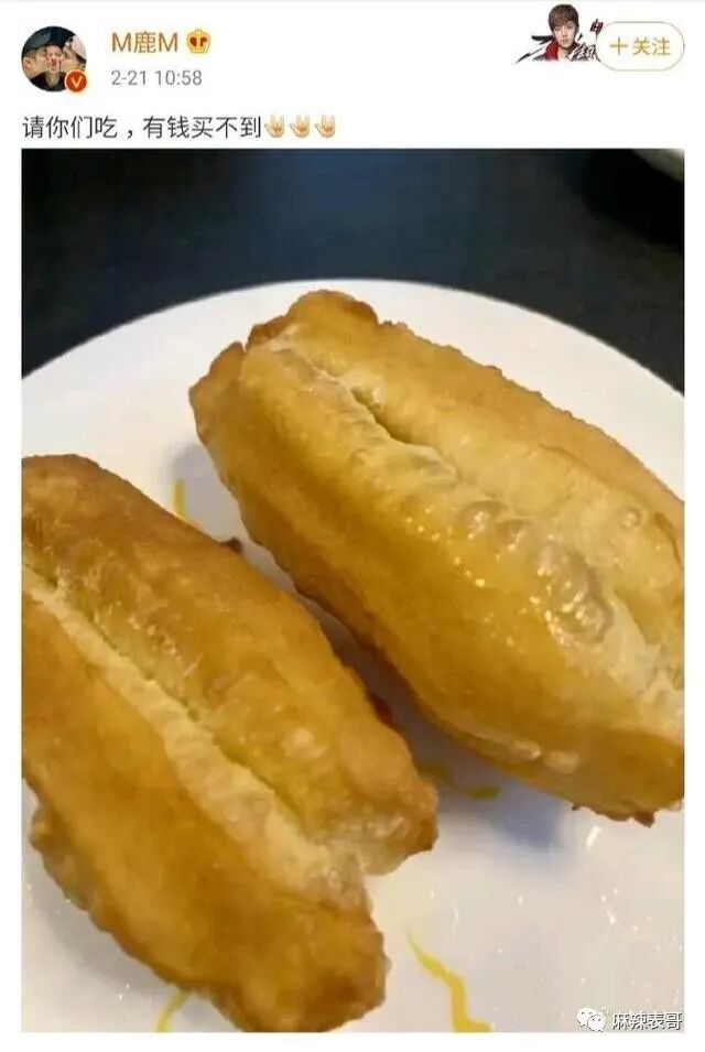 2月21日,鹿晗发了一条博文,说“请你们吃,有钱买不到”,配图是两根油条。
