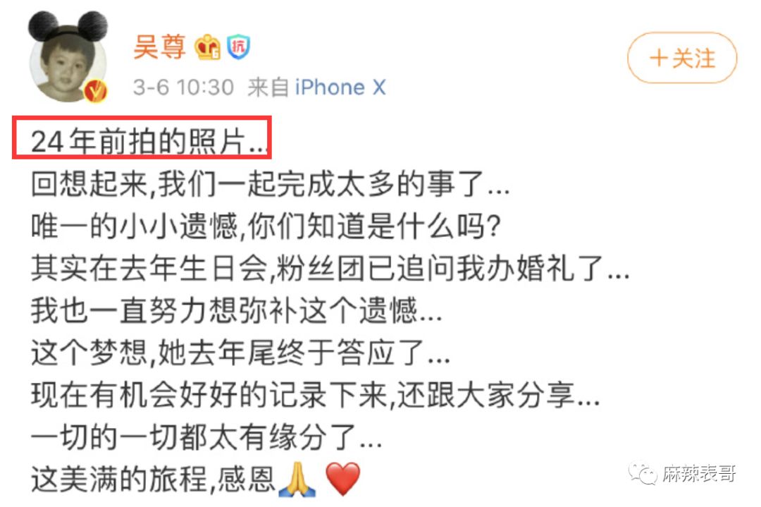 吴尊也非常配合此次节目的宣传,特意发了一篇微博,分享了一张和自己妻子林丽吟的合影,照片拍摄于24年前。