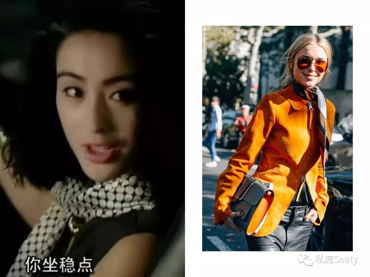 配饰上也很值得借鉴,窄丝巾增添复古柔情。