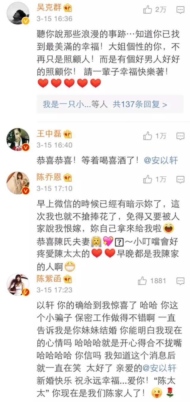 微博一发布,安以轩圈内好友吴克群和陈乔恩等纷纷送上祝福,老板王中磊也说:等着喝喜酒了!