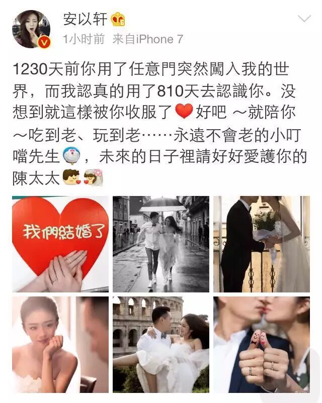 刚刚过完狗粮满满的白色情人节,今天下午安以轩突然在微博上po出一组结婚照,还配上超级甜蜜的文字:陪你吃到老,玩到老,署名是陈太太!