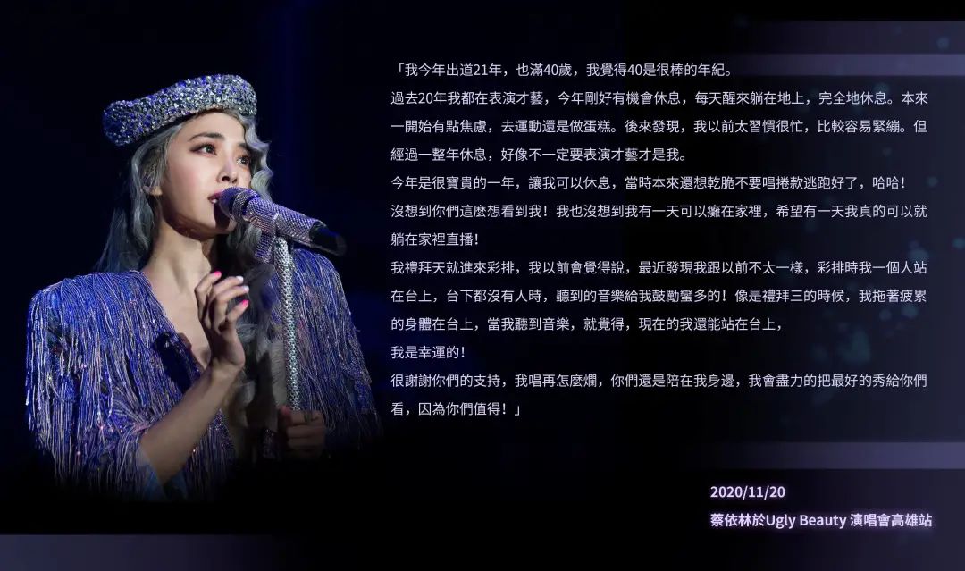十天前的Ugly Beauty演唱会,蔡依林讲了那段几乎所有粉丝听完都很感触的话:“我今年出道21年,也满40岁,我觉得40是很棒的年纪。