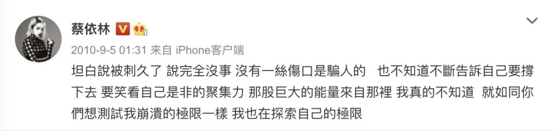 的确,被网暴那么久,她仅有的公开情绪也只是发了一条微博,而那条微博的最后一句话还是她在同自己较劲:就如同你们想测试我崩溃的极限一样,我也在探索自己的极限。
