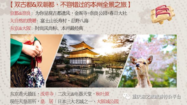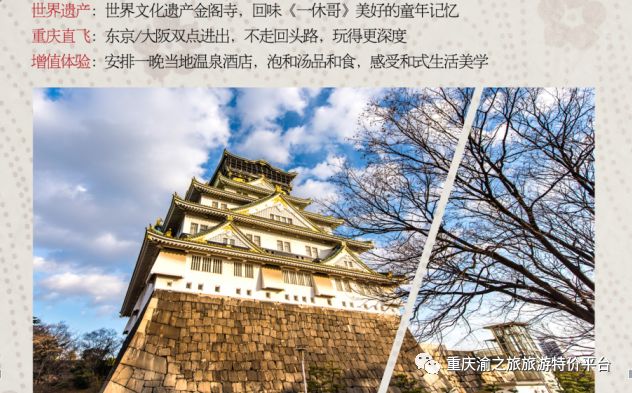 和服表演 | 世界文化遗产•【金阁寺】游览时间不低于30分钟:金阁寺又名鹿苑寺,来到这里一定会勾起你儿时的记忆,还记得《聪明的一休》里成天为难一休的将军足利义满吗?寺院就是以他的法号命名的,后因其寺内核心建筑“舍利殿”的外墙全是以金箔装饰,所以又称为“金阁寺”。 【西阵织和服会馆】游览时间不低于30分钟:“吃倒在大阪,穿倒在京都”。在天子脚下谋生的西阵自15世纪起就聚集了许多织工,生产出了华丽高贵的“西阵织”。西阵织是把丝线先染过色后才织成图样的纹织品,是驰名世界的日本代表性工艺品。当然最不能错过的就是这里的和服表演啦。 |