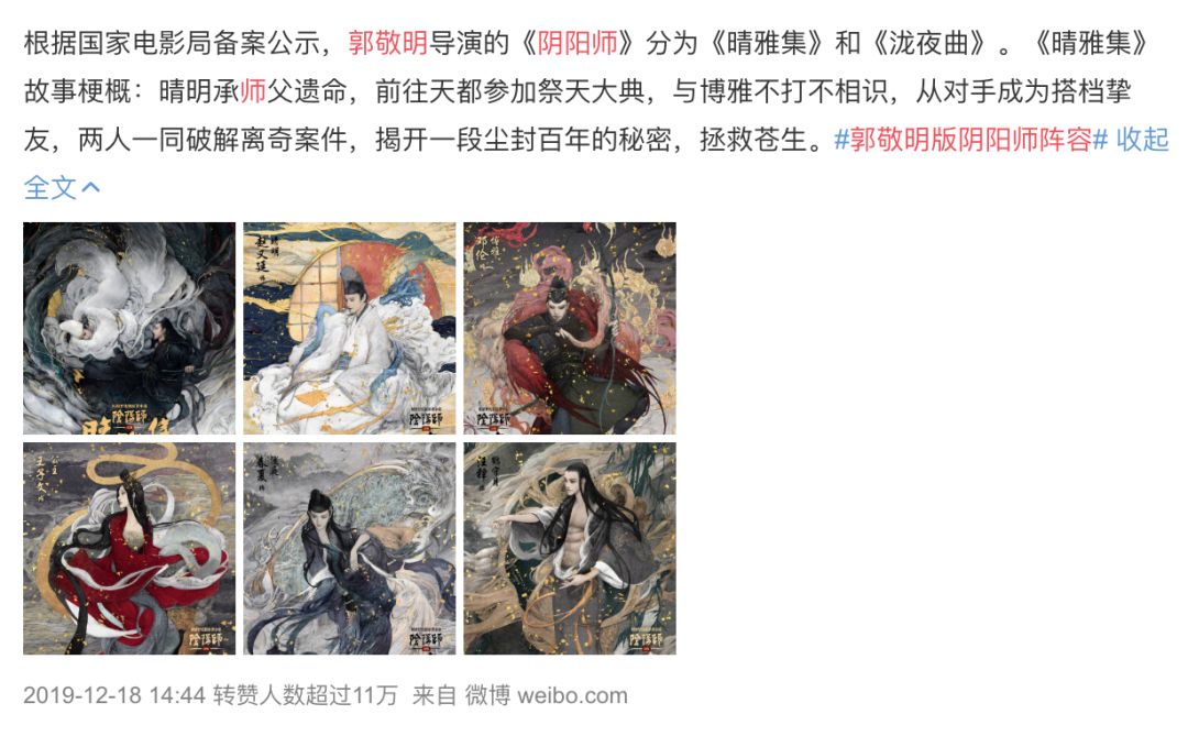 而本次郭敬明所执导的电影《阴阳师》,分为《晴雅集》《泷夜曲》上下两部。