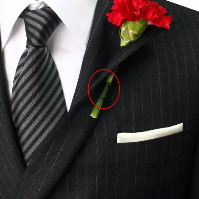 插花孔在西装的左驳领上,遵循这个传统,花眼和花枝固定袢带成为好西装的鉴别点之一。市面上绝大多数西装不懂这个文化,驳领就算开了花眼,背后也会遗漏固定袢带的,使襟花的花杆不好固定。所以很多人带襟花的时候,只能用夹子或粘胶带将花枝固定在驳领上。