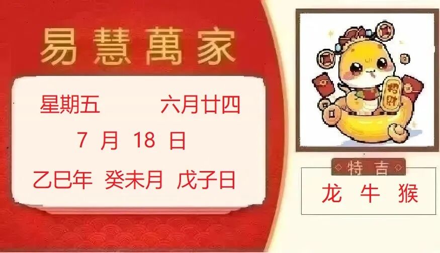2025年7月18日,星期五,农历六月廿四 (乙巳年癸未月戊子日),法定工作日。