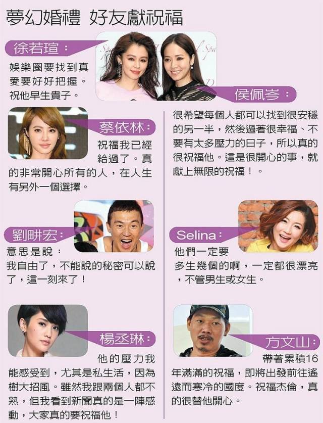 据台湾媒体报道,周杰伦请亲友前往观礼,提供食宿花约1000万元台币,还租下霍华德古堡举行派对,据传该场地光一晚的费用,就需付台币19.5万台币,搭配交响乐、摇滚乐团的陪衬,另再加上教堂,仪式,两边至少得负担800万台币;两人的婚纱照请到徐若瑄姐夫苏益良掌镜,还跑到德国天鹅堡、捷克布拉格、法国巴黎3国取景,打造童话般的梦幻,至少也得耗费500万元台币,总计台币2300万元台币(约451万人民币)。