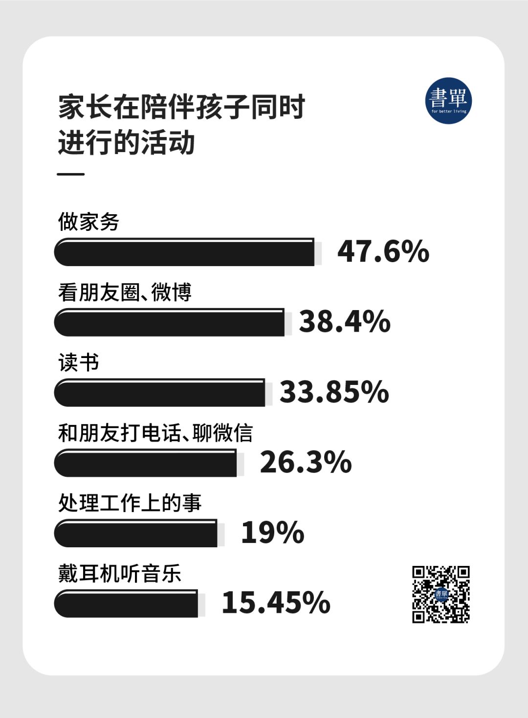 在中国,像良多这样的父母并不少见。《2017中国家庭亲子陪伴白皮书》的数据记录了真相:父母在陪伴孩子的时候,47.6%的家长会兼职做家务,38.4%的家长会刷朋友圈、刷微博打发时间。