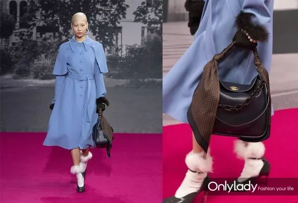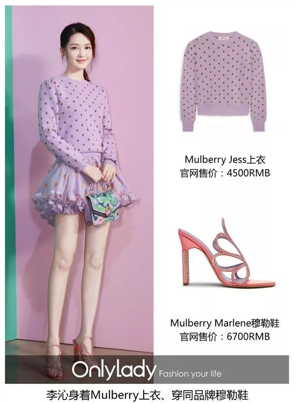 李沁身着Mulberry Jess浅紫色波点上衣,搭配限量版Harlow小号学院包现身秀场,以东方淡雅气质诠释英伦甜美风格。甜美中不乏一丝碰撞对立之美。