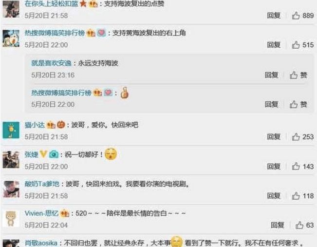 而对于他今年低调复出,将自己执导拍戏的消息,网友们的评论也都是呼唤黄海波赶快出山。在最近的5月20日发出的一条虐心微博下面,网友们也是直言自己对海波的思念。
