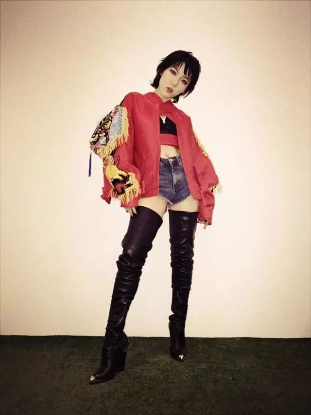 吴莫愁虽然打扮很怪异,但是身材是真的很好,短款运动bra top,外搭红色棒球衫,很漂亮,下身牛仔热裤搭配超长长筒靴,露出大腿很性感。