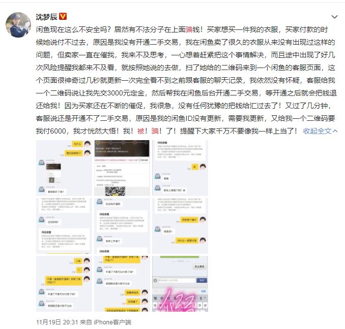 昨天,湖南卫视主持人沈梦辰发微博称自己被骗了,还贴出了她与骗子的整个对话截图,原来她是在某二手交易网上卖衣服,对方称一直给她转不过去钱,于是便有了骗子教她落入圈套的一系列操作。