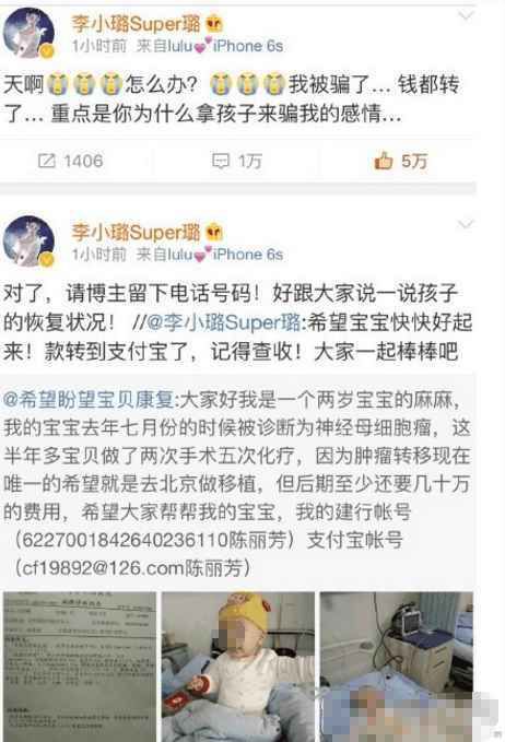 李小璐当年因为做好事也被骗过,一位微博网友自称自己的宝宝生了重病,需要钱救助,李小璐好心转发微博,并且还给对方打了一万多块钱,最后发现微博被删了,网友也没了踪影,她才意识到自己被骗了。