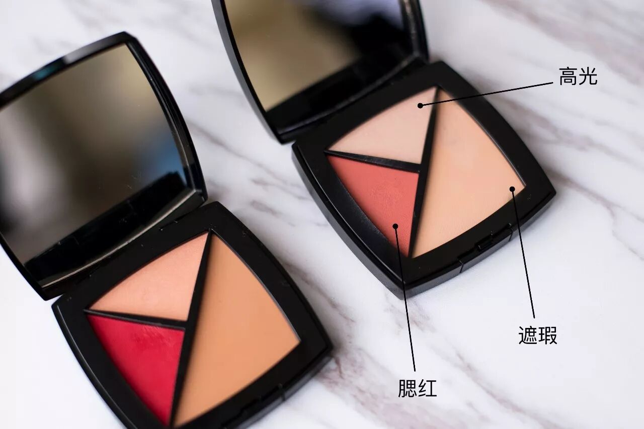 亮白色是高光,有高纯度的贝母闪光微粒,很轻微的光泽,用软软的刷子扫在全脸都很好看。深色部分用作阴影,与大部分欧美彩妆分明的阴影不同,她软软的膏状感很能与皮肤融合起来,不太会显示出化了妆的痕迹。