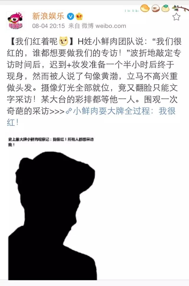 活见久,有生之年能亲眼开到官媒公开手撕艺人,某H姓男星采访耍大牌,因发型被说像影帝黄渤,而要求重做,推翻采访。虽然没有直接爆名,但是剪影不要太明显。