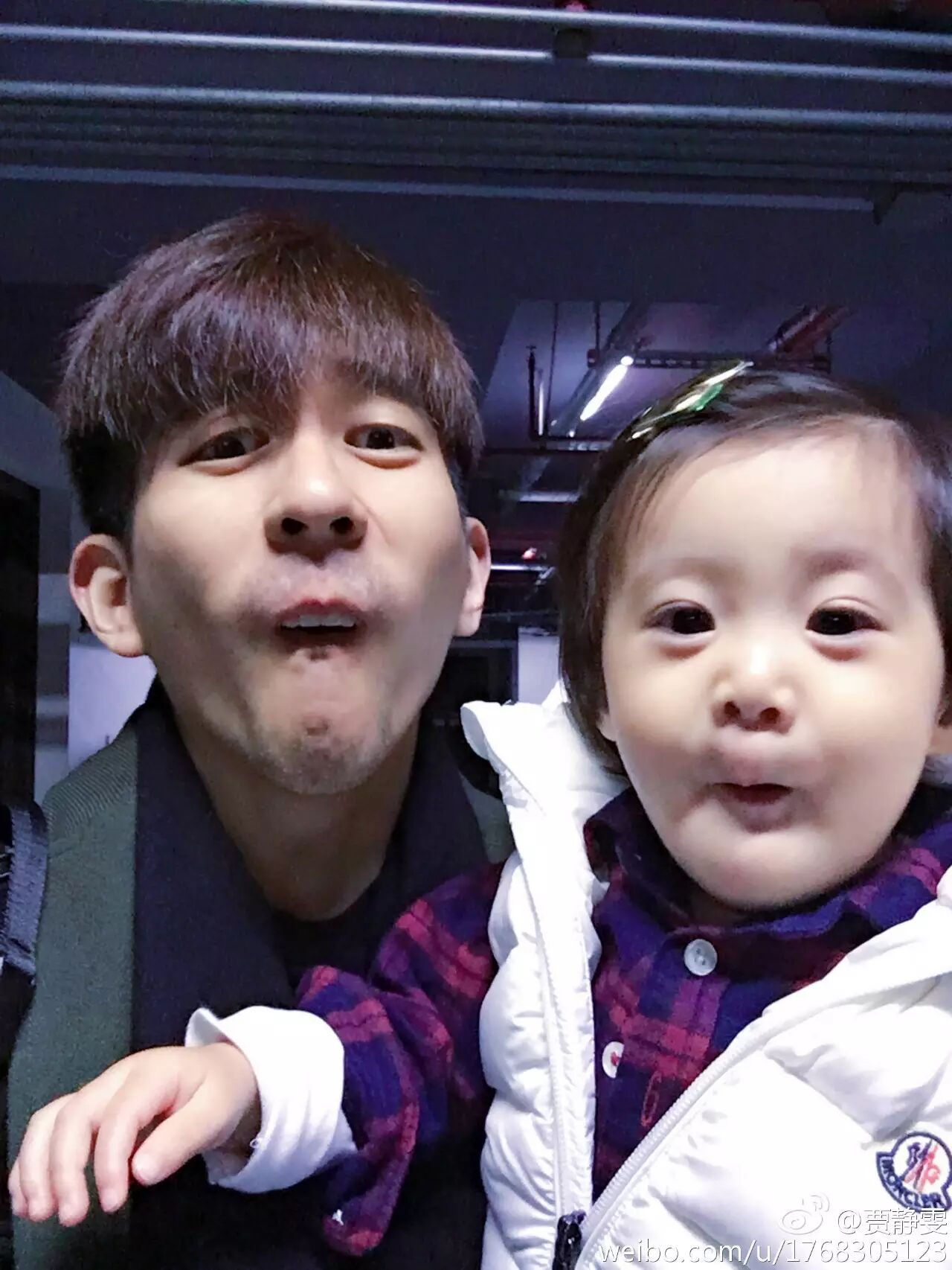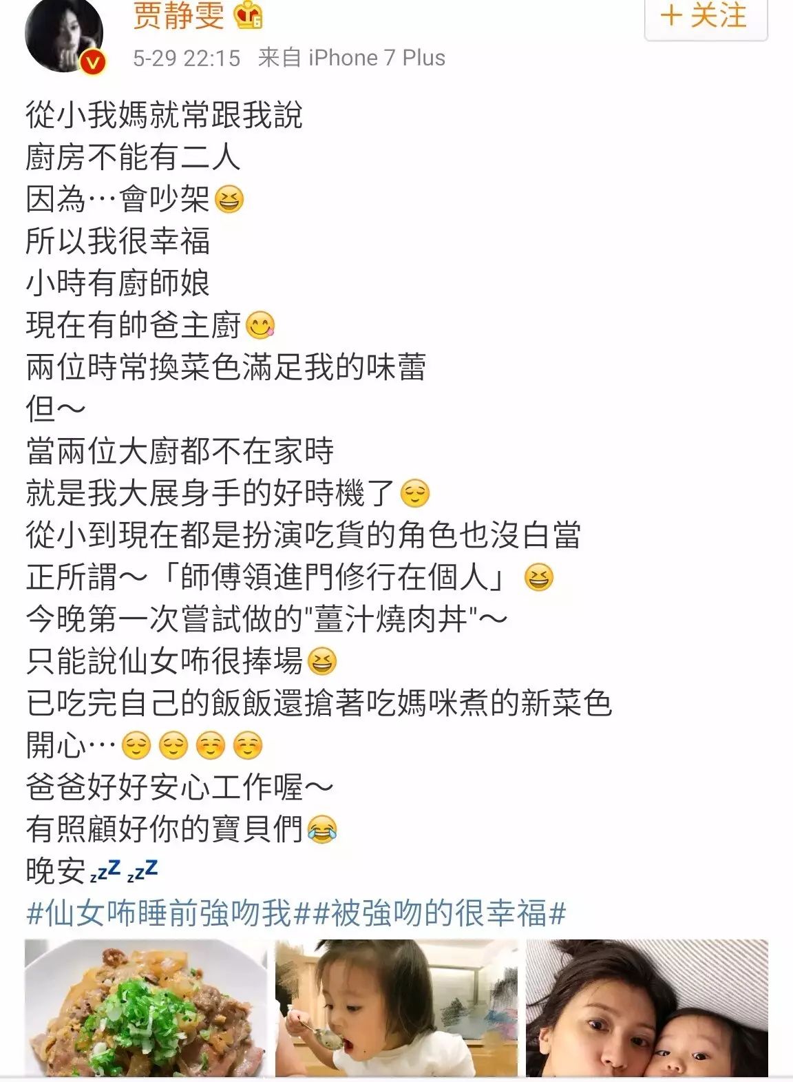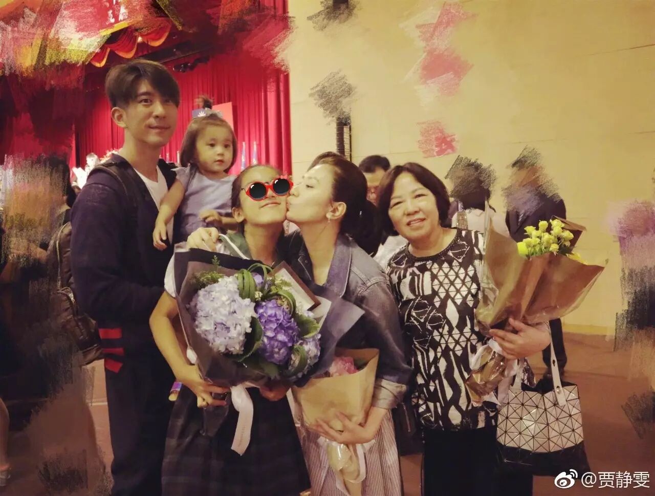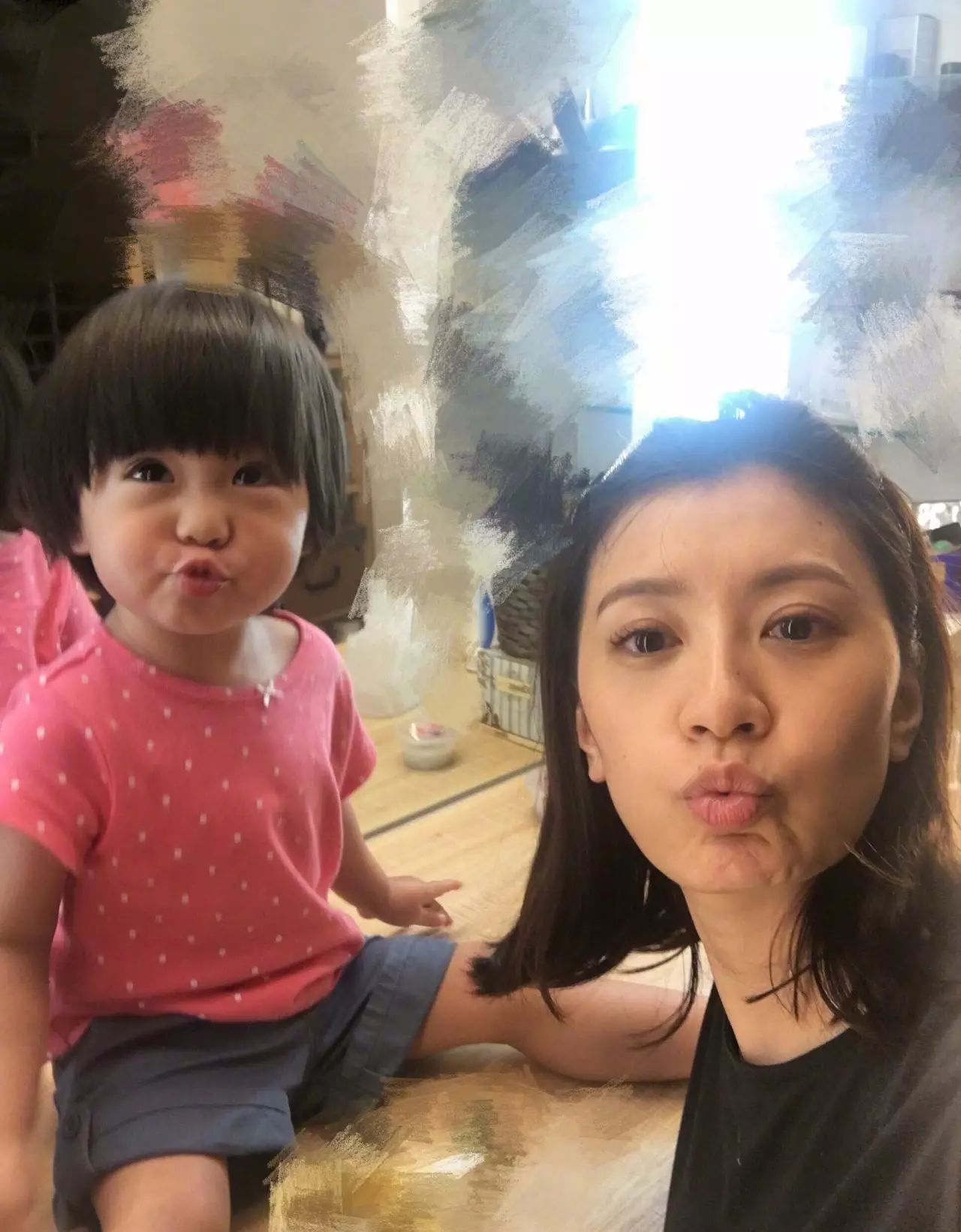 贾静雯还分享了一张咘咘亲bobo脸蛋的照片,看起来超级有爱,而且她还说到姐姐们都爱亲亲小妹妹bobo的脸蛋~
