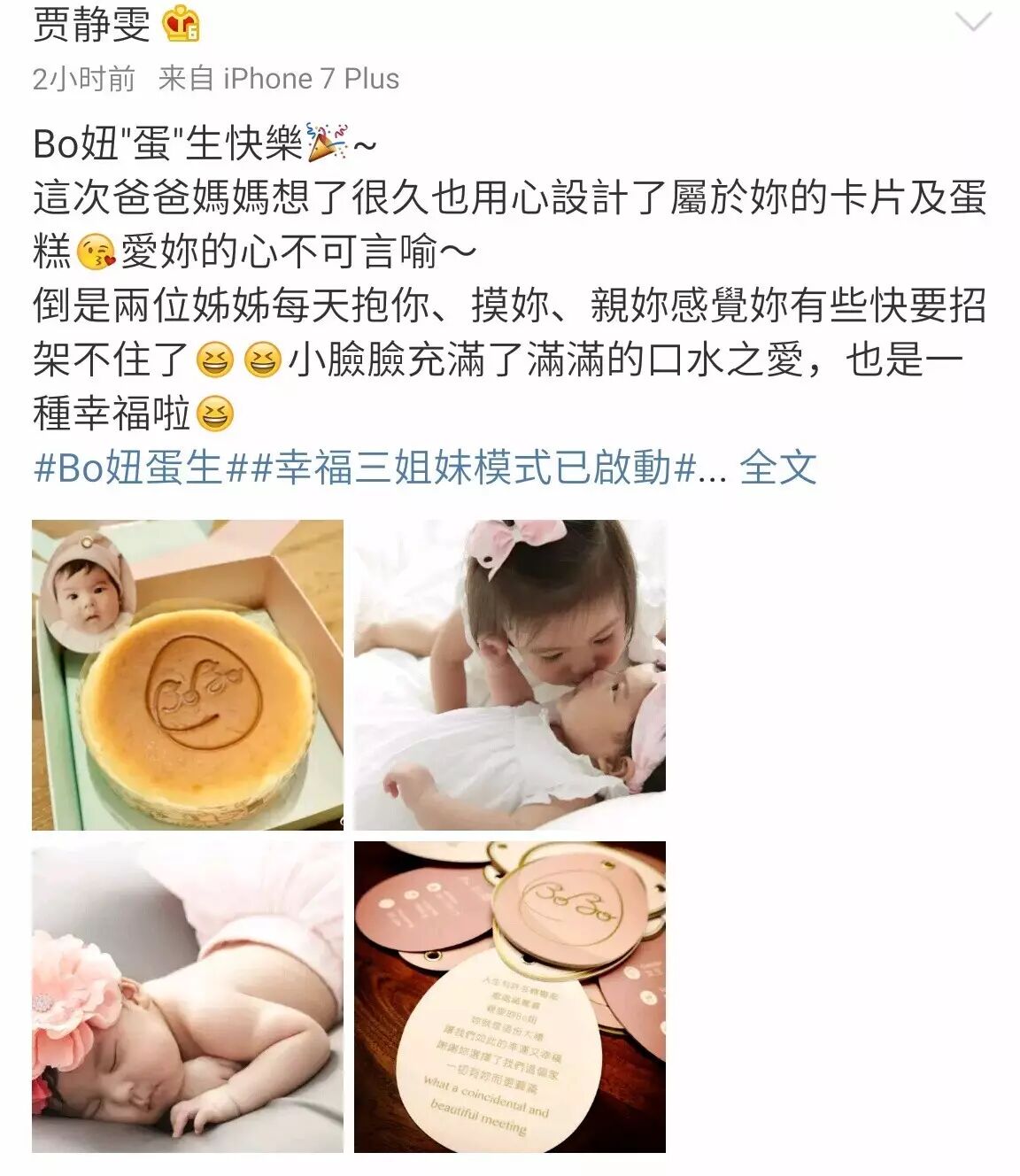这两天娱乐圈真是有点忙,庾澄庆周杰伦,大家在都在忙着迎接萌娃。这边萌娃之家的贾静雯一家也没有闲着。小咘咘的妹妹BoBo满百天啦!因为出生在鸡年所以小bobo的生日卡片也选择了用鸡蛋的形状,卡片里满载着家里对小bobo的爱。