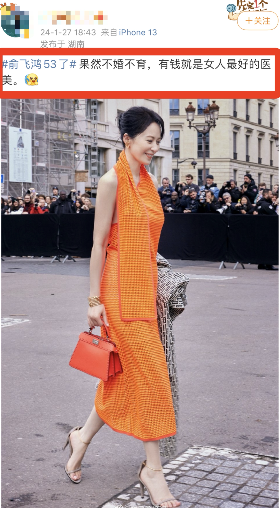 53岁俞飞鸿美出天际,近照惊为天人:她,无可复制 周冲的影像声色 内地女星 2024-01-30 04:49:45 292 创作不易,用心坚持,欢迎请BaGua喝几杯爱心咖啡!打赏并支持本文 打赏并删除本文 中年女人的心态,是会着相的。你内心紧绷,日日焦灼,外型自然有颓丧感、攻击感。你内心通透,精神超然,容颜自然如风如月。在俞飞鸿身上,你一点也感觉不到俗气、拧巴和颓败。她的貌,是美的。她的气息,是灵动而自在的。如风过际,静水流深。前两天,俞飞鸿一组近照曝光。艳惊四座。她身着一袭橘红礼裙。发型简洁,妆容低调。但那种清宁的气质,脱俗的风情,令所有人挪不开眼睛。谁能想到,她已经53岁。年过半百。却仿佛岁月无侵。站在镜头前,依然美得沁人心脾。徐静蕾评她:“她的美没有攻击性。第一眼很舒服,第二眼就觉得很美,再一看觉得不仅美还很有气质。”深以为然。你看她,或行,或停,或立,或坐,都有清光打在她身上。外界喧嚷,她不动。万声沸腾,她不惊。她不乱,不惧,不讨好,不强求。她就是她。稳如植株,静如日月。和20多岁的明星名模坐在一起,她的美貌,依然脱颖而出。你会觉得,万花争艳。千芳竞宠。而她只是存在,无需说什么,做什么,就已鹤立鸡群。这次秀场图中,有人做了一个不同年龄段的女星对比。不论对方是26岁、27岁、42岁,俞飞鸿依然赢了全场。她赢在哪里?除了容貌、体态,就是那人间少见的清醒气度。行走中的俞飞鸿,更是气场流动,灵气淋漓。仿佛整个人,就是一道橘色柔光,照亮一个个昏昧、苟且的世界。俞飞鸿曾说:我会一直美下去。无论多老。若是其他人说这样的话,你会觉得中二、托大、不知天高地厚。但她说起来,你只觉得:她没说错。她一定会优雅到老,美丽至死。这种信心来源于,她从始至终,都是守恒的、清澈的、自洽的。仿佛她的内心,有一个清灵的能量场。一直平衡地运转着。自成宇宙,不为他扰。从不自相矛盾,从不自我消耗,也不自我加罚。她接纳一切。而这种接纳,令她丰盈,又令她宁静。看完这组照片,许多人感叹她的冻龄。冻龄,多诱人的词。它为许多女星所求,也为天下女性所渴望。为了它,许多中年女星、有钱女性狂做医美、整形、拉皮、打针。龄是冻住了。但哪一个的脸上,没有挣扎之感,没有僵木之态。或多或少都有。唯有俞飞鸿,清如水,灵如风,自在如轻云。我本以为,她作为女明星,和其他人一样,也会强求。强行留住岁月。强行显年轻。强行讨好白瘦幼的审美标准。但了解俞飞鸿之后,我发现,我们对她的理解,真的太偏狭,也太局限了。她根本不在意。她出众的美貌与气质不是求得的。如果非得给一个来源,我找到的,只有两个字:自由。俞飞鸿说:“我对自由的追逐,或者是向往,实在是太深了。所有一切让我觉得不够自由的东西,我都可以舍弃。”何等透彻,又何等绝决。但并无夸大之处。从18岁起,她就意识到,她这一生最想要的,是能够获得自由。她出生于1971年。父亲是清华大学高材生。母亲是浙江化工学院高材生。高知家庭,往往对孩子望子成龙。她在教条中长大。要如何,不要如何,罗列得清清楚楚。理所当然,她成为学霸,轻松考上理工类大学。但此时,自由的种子已经埋下。她说,“这一生,我不会做任何一个人、任何一种东西的奴隶。”为了自由,她不顾父母反对,放弃理工类大学。转而考取了电影学院。毕业后,她被留校任教。安稳、体面的体制内人生,就摆在眼前。她同样不要。她决然离开,只身一人前往异国留学。在另一种秩序与文化里,寻求自由的可能。父母埋怨她叛逆。她说:“我一直希望,自己在精神和内心上是完全自由的。任何束缚我的东西都希望去打碎它。如果说这是叛逆,那么为了自由我会叛逆。”我从未见过一个女明星,将自由二字,视为生命的终极意义。只有俞飞鸿。她为自由而活,也可以为自由而舍弃所有。人们所奢求的名、利、权、情、欲、认可、美貌。她都不以为然。“我越来越不在意这些。”仿佛穿行在人生麦田里。别人一路走,一路捡拾麦穗。拥有越来越多。背负也越来越多。她却“一路走,一路丢包袱......越来越轻松,也越来越放松。”为了不被驱使,不被奴役,她放弃了太多。不。你甚至不能说“放弃”。——放弃二字中,也有用力的、刻意的、“算了”的成分。她没有。应该说,“看破”的东西越来越多。比如美貌。美貌为每个女人所求。她不求。凡有所“求”,必成枷锁。它会控制着你,往那个标准,营营役役,不得终日。她不要。她是电影学院10年一遇的校花。从幼年起,相貌就极为出众。但她无知无觉。直到高中时,蜂拥而至的男生、花式的表白、各种特权,令她知道自己是不同的。大学期间,追求者数不胜数。再后来,她成为无数人的女神。许知远见了她,分寸大乱,满脸潮红,喃喃说:“你真的是很好看啊。”高群书说她:“强悍可怕,妖媚感十足。”窦文涛视她为无法企及的女神。美而自知,许多女人会走上一条路。恃靓行凶,尽享美貌红利。俞飞鸿从不为此骄傲。她说:“长相这个东西,我实在是毫无骄傲感。因为我对它没有任何贡献或者创造力在这个上面,所以我不觉得我有什么可以因为这个事情而自豪的。”她不因美貌骄傲。更不因此受困。只是觉得,一颗“美”的心,比“美”的皮囊,重要太多。因为洞悉美貌的真谛,她曾笃定地说:“如果你一定要问我对美的认知,那