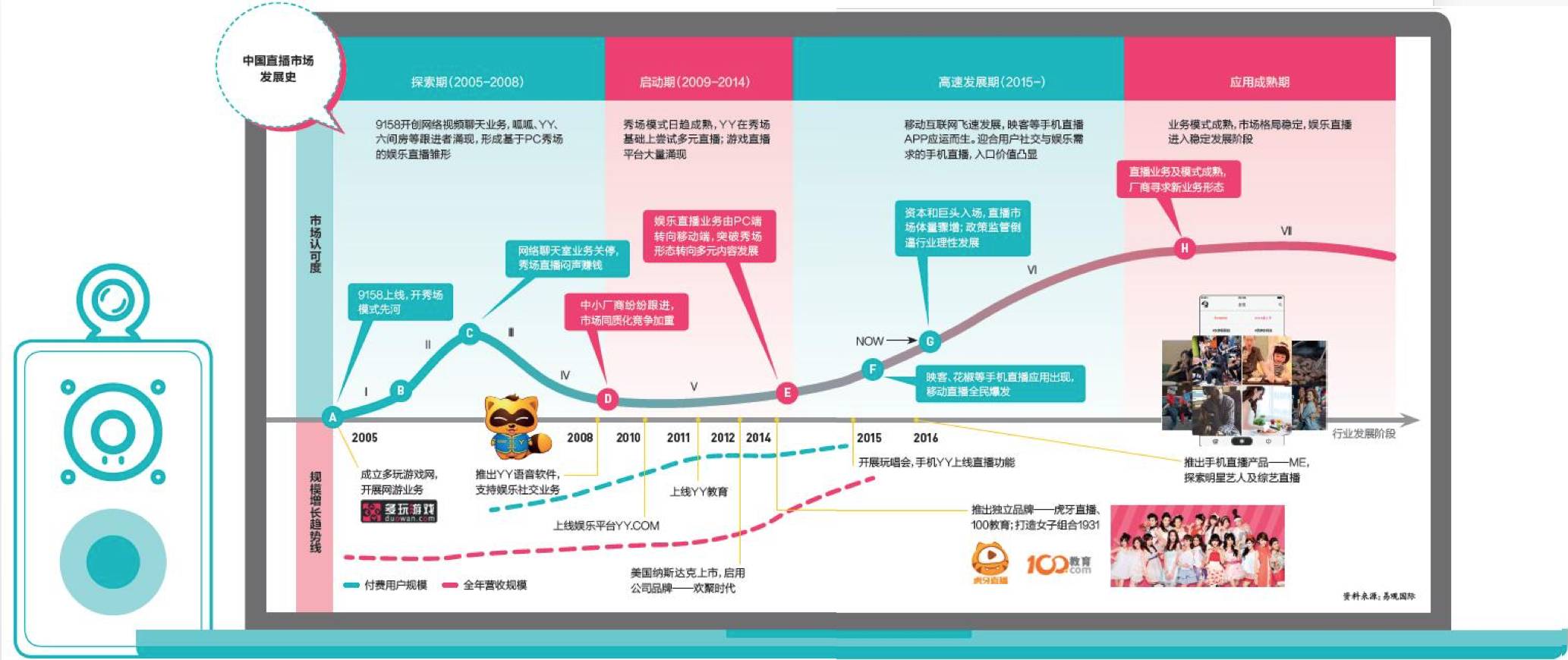 江湖的缔造者门派分明、各自为战,有时难免擦枪走火:以YY、9158为首的传统秀场;以斗鱼、熊猫为首的游戏直播;以映客、一直播、花椒为首的泛娱乐直播;以及其他细分领域的垂直类直播。一个惊人的数字是,2016年平均三天就有一家直播平台成立。据艾瑞咨询等机构的报告显示,2020年网络直播行业市场规模将有望突破1000亿元。国内直播平台数量已超过200家,超过30家平台宣布完成融资,累计融资额突破50亿元。