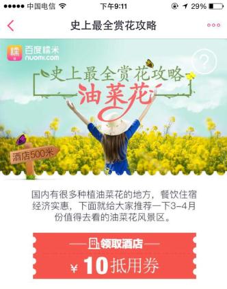 听说春天是一个适合看油菜花的季节,而看油菜花的时候又是偶遇美女帅哥几率最高的时刻!所以出门去看看油菜花必然是我们这次踏青出游的首选啦!那么问题来了:怎么去?住在哪?憋着急,百度糯米早就给你安排好了:去看油菜花,可立即领取周边酒店10元抵用券,让你看着油菜花就把酒店舒舒服服的给订了!