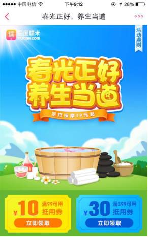 最后,玩了一天也蛮累的了,贿赂小伙伴来个足疗按摩神马的其实也是很美妙。百度糯米为大家精心准备了“春光正好,养生当道”活动,全程高能发放“满99减10”和“满399减30”优惠代金券,足疗按摩19元起也是门槛低的不要不要的~