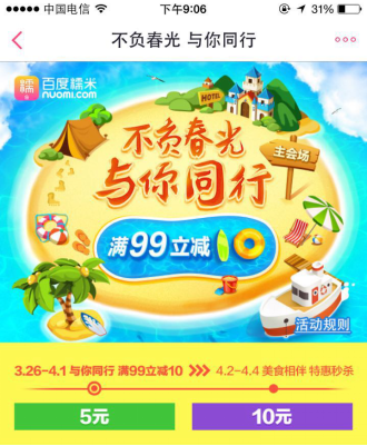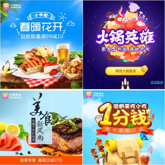 其实,春日游玩也好,踏青撩妹也罢,永远离不开的话题都是跟家人朋友吃吃吃:百度糯米特推出春暖花开自助餐,满99立减10元;同时还有“美食新风尚,专属你的味道”新客专享,立减17元清明特惠活动;火锅五折开涮、春游饕餮开胃小吃1分钱秒杀活动也是一个都不能错过,因为,朋友父母与春光美食更配哦~