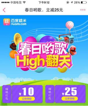 还有,一块出来玩不唱歌那还叫基友闺蜜吗?百度糯米为了帮助大家在最美好的时光留下最美好声音那也是煞费苦心:“春日呦歌,High翻天”最高可立减25元,们,憋等了,尽情嚎吧!