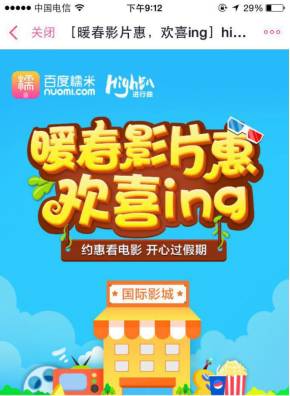 大好春光,撩妹泡汉的同时别忘记了自己那一帮基友闺蜜,记得常联系!撩妹已经囊中羞涩了?百度糯米能帮你:清明期间,“暖春影片惠,欢喜ING”活动,电影票最高可减13.4元,每天10点,限量开抢!