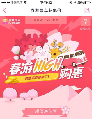 说时迟,那时快,有情怀的百度糯米立刻就推出了”不负春光,与你同行“清明出行大作战,让宝宝们与家人朋友踏青出游,其乐融融,偶遇妹纸,快快脱单~