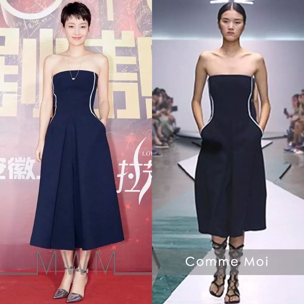 Comme Moi 是她最常穿的牌子,有设计感的抹胸连衣裙就能衬托出气质,银色尖头高跟鞋选得估计比年轻的你高出好多个段位。
