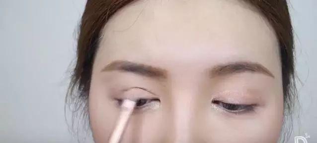 涂眼影。首先用不带珠光的乳白色眼影涂在整个上眼皮和眉骨处。