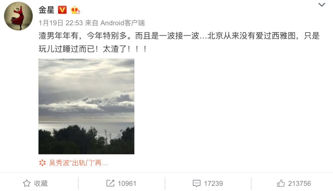 就连金星都坐不住了,发微博说道:“渣男年年有,今年特别多,而且是一波接着一波……”