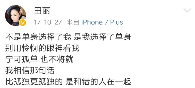 并且还霸气地回应“单身传言”:“不是单身选择了我,而是我选择了单身。别用怜悯的眼神看我,宁可孤单绝不将就”。