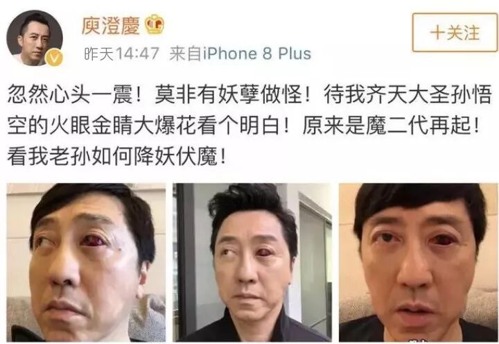 日前,庾澄庆晒出三张眼球充血的自拍照,并配文称:“忽然心头一震!莫非有妖孽作怪!待我齐天大圣孙悟空的火眼金睛大爆花看个明白!原来是魔二代再起!看我老孙如何降妖伏魔! ”